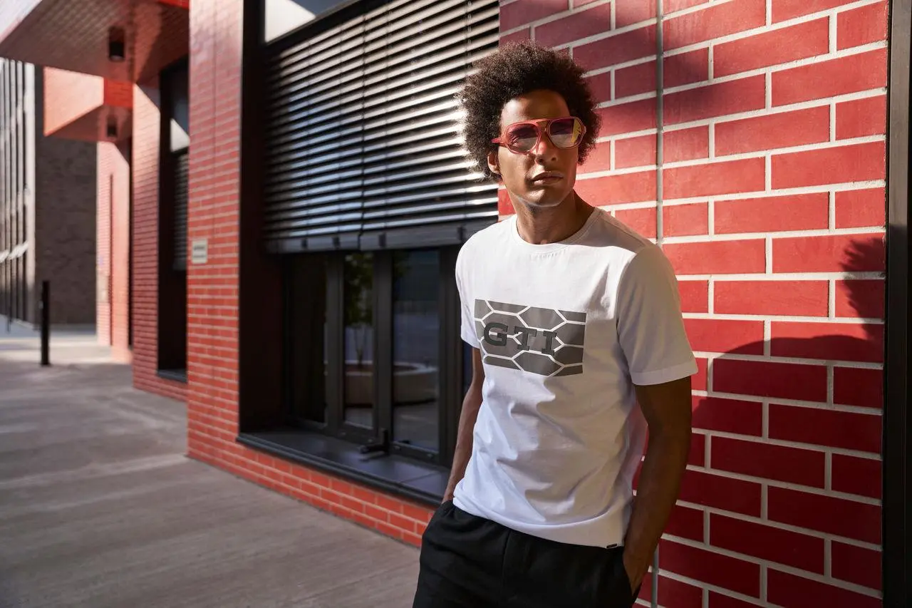 Basic für GTI Liebhaber. Das Rundhals-T-Shirt im GTI Design trägt auf der Vorderseite einen erhabenen, reflektierenden Wabendruck und hat eine GTI Niete am Saum.