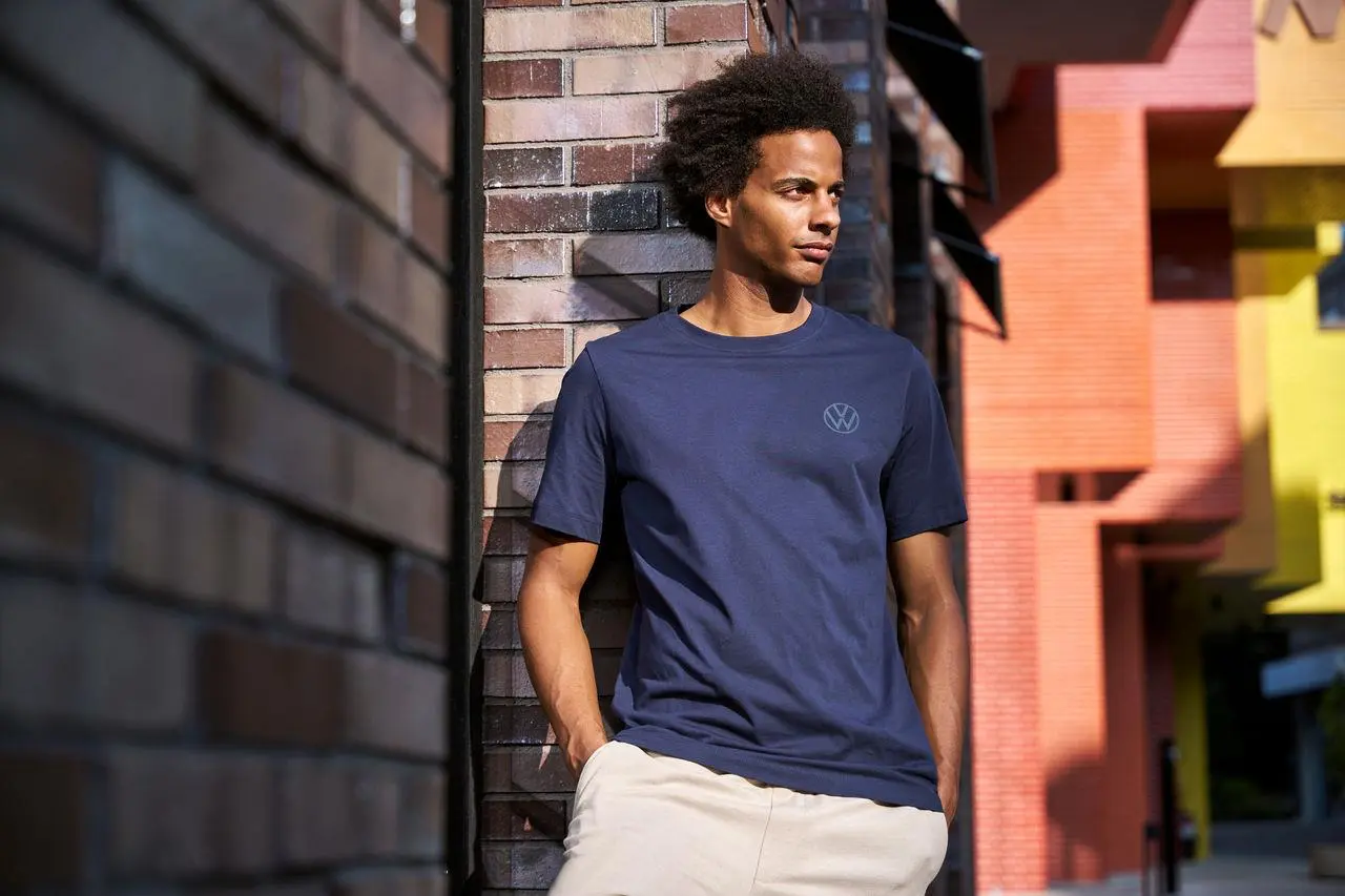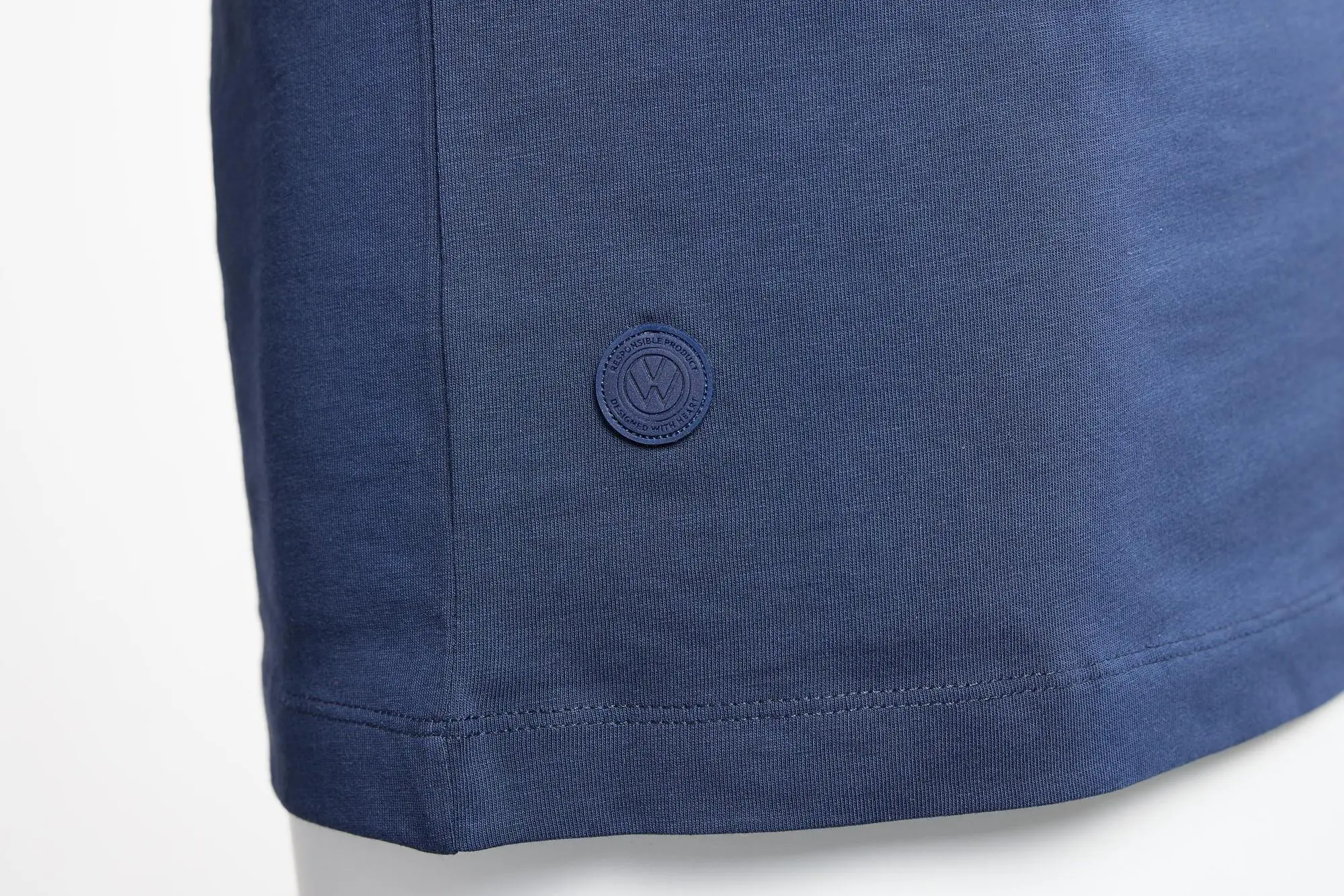 Mit diesem Klassiker zeigen Sie Stil. Das T-Shirt mit Rundhalsausschnitt in Dunkelblau zeigt das VW Logo Ton in Ton.
