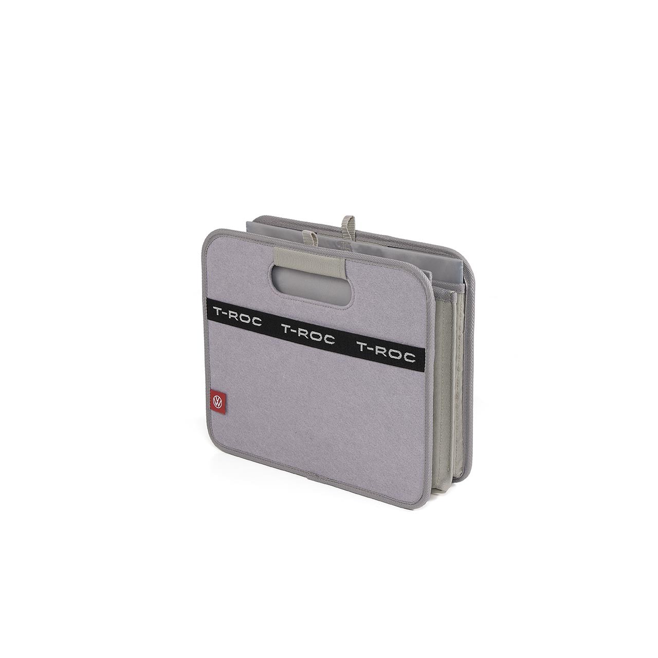 Ob für den Kofferraum, den Einkauf oder einfach zum Ordnen zuhause – die T-Roc Faltbox aus robustem grauen Filz ist dein vielseitiger Helfer. Kompakt faltbar von 50 cm auf nur 4 cm Tiefe. Schwarzes Gummiband mit T-Roc Schriftzug zum sicheren Verschließen. VW Weblabel in Flame Red als sportliches Detail. Leicht, stabil und immer einsatzbereit – so bleibt alles ordentlich und im echten T-Roc Style.